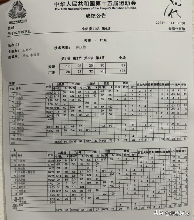 第四节,孙承信、马如一试图率队缩小分差,但王浩然持续火热的竞技状态下,最终,广东22男篮顶住天津反扑,以105-82击败天津,取得小组赛三连胜。