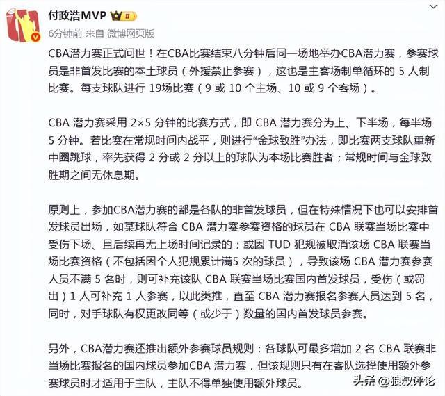 媒体人付政浩发文点评:“CBA 潜力赛采用 2×5 分钟的比赛方式,即 CBA 潜力赛分为上、下半场,每半场 5 分钟。若比赛在常规时间内战平,则进行“金球致胜”办法,即比赛两支球队重新中圈跳球,率先获得 2 分或 2 分以上的球队为本场比赛胜者;常规时间与金球致胜期之间无休息期。