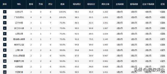 CBA最新排名:京粤4连胜争第1 辽宁领衔4队紧随 3队一胜难求
