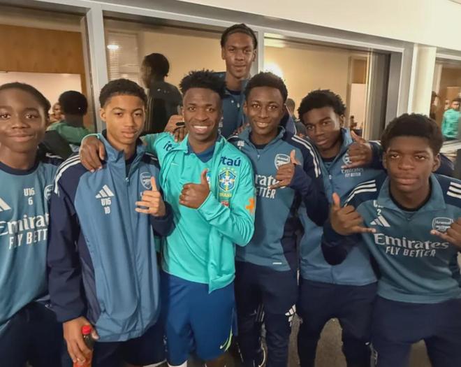 阿森纳青训小将们和巴西球星维尼修斯合影。