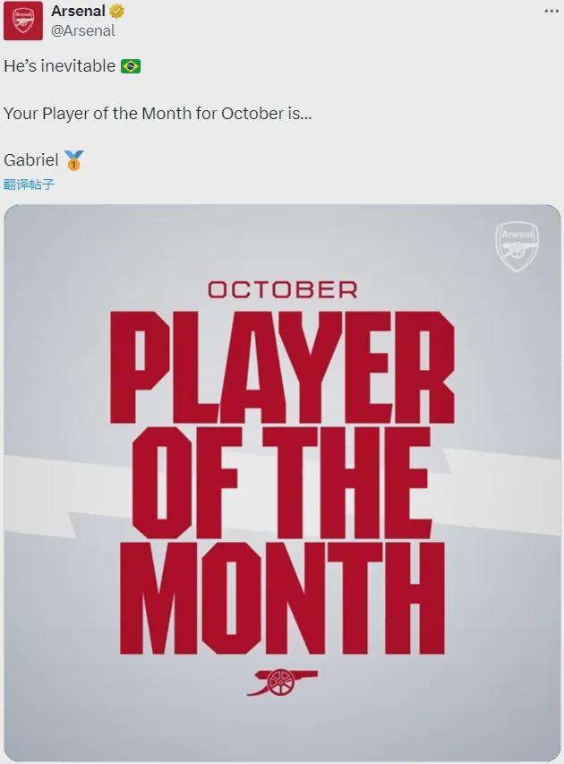 官方:加布里埃尔被阿森纳票选为了队内10月份最佳球员,巴西人得到了45%的支持,击败了赖斯、廷贝尔和萨卡,这也是加布里埃尔效力阿森纳以来第6次获此殊荣。