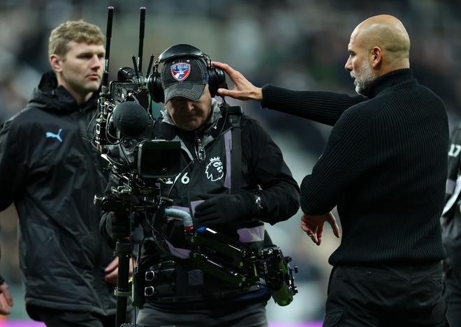 在比赛结束之后,曼城主教练瓜迪奥拉被拍摄到走向了场边的一名摄影师,并且还摘下他的耳机对他说了些什么。