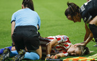 惊险一幕,马竞女足球员梅迪纳头部被膝盖撞到后失去意识